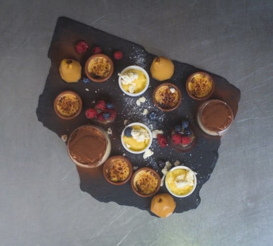 - Melting chocolate cake - Lemon cream - Meringues - Vanilla crème brûlée - Poached pear - Tiramisu