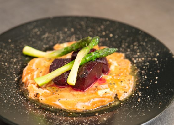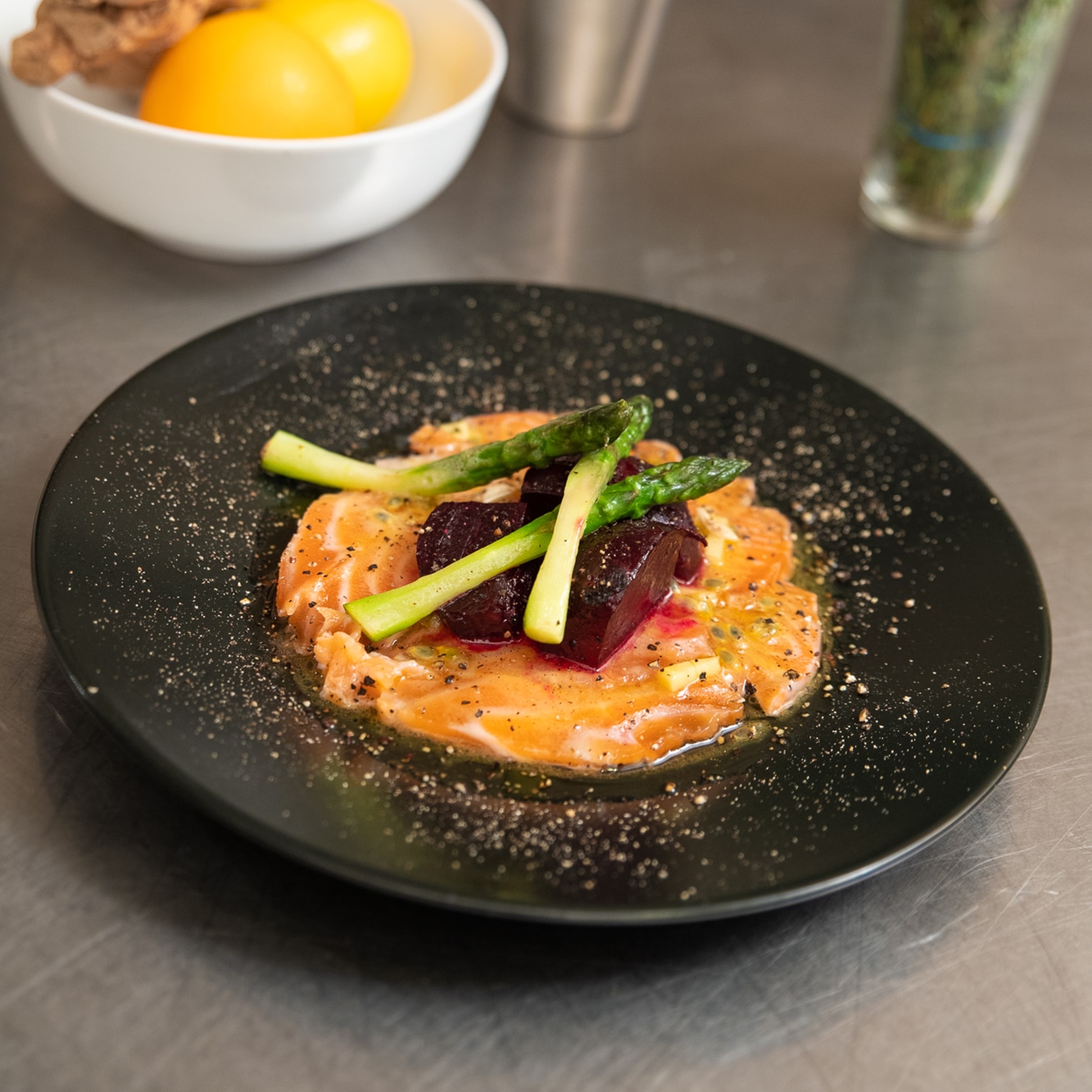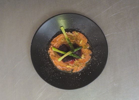 - Saumon gravelax et sa marinade agrumes gingembre, betterave glacée et asperges croquantes - Gambas à la thaï, bouillon, gingembre