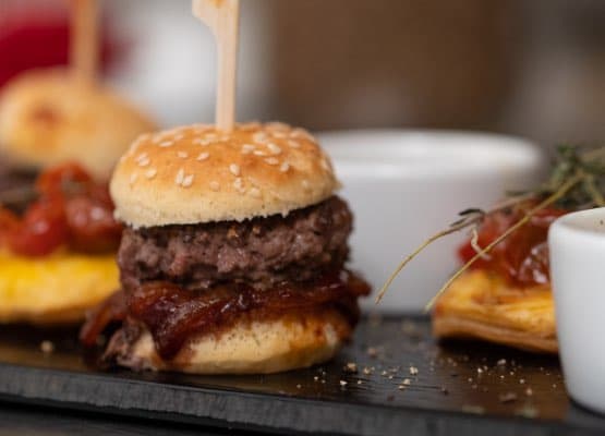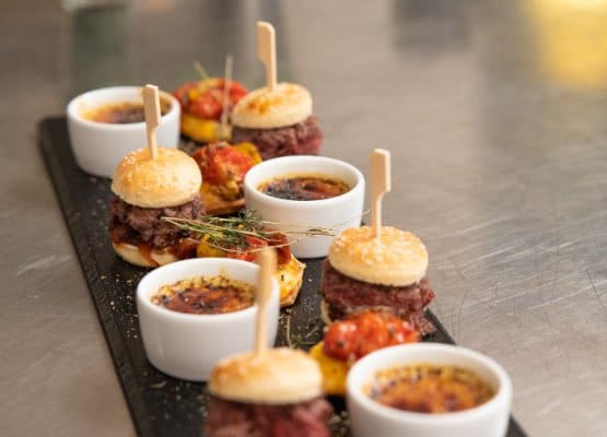 - Tarte tatin tomates cerises - Mini-burger de boeuf, pâte à tomate - Crème brulée au lard