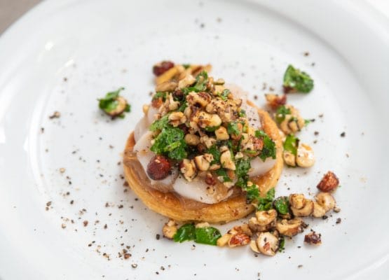 - Terrine de foie gras aux épices sur sa brioche, asperges glacées, caramel d’épices - Tarte fine de Saint-Jacques, purée de topinambours, vinaigrette coriandre et noisette