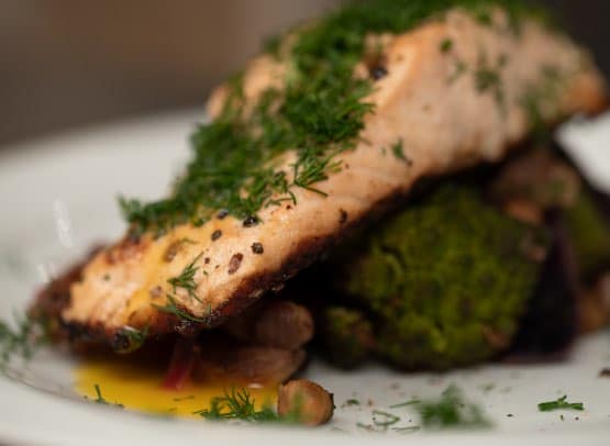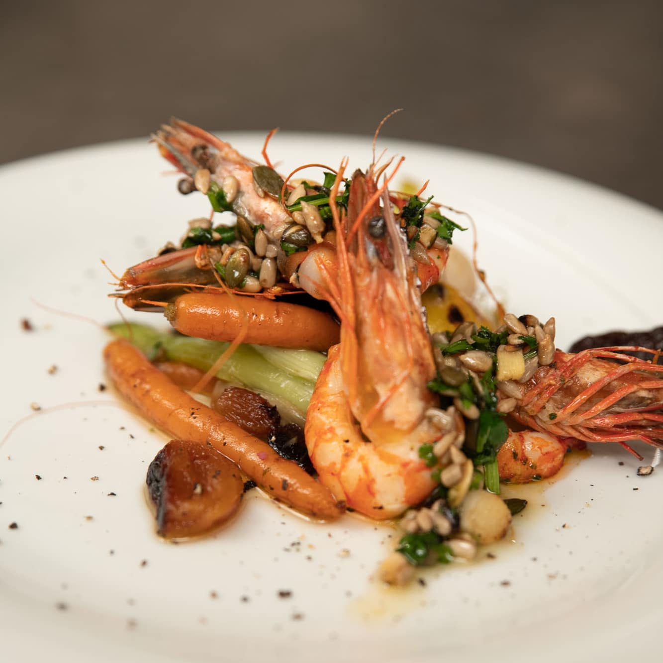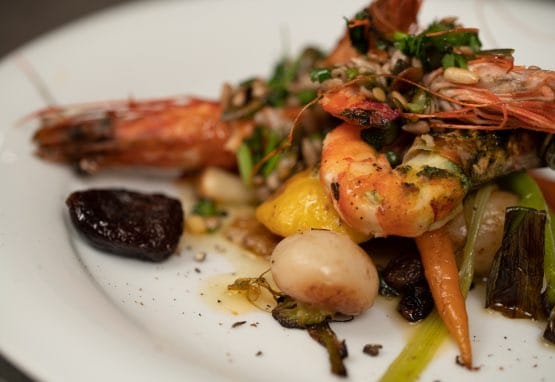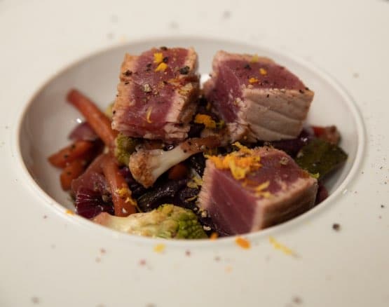 - Pavé de saumon, curry de légumes, vinaigrette d’agrumes - Tajine de légumes, gambas saisies, vinaigrette coriandre et graines torréfiées