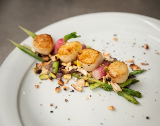 - Noix de Saint-Jacques à l’huile de pistache, pistaches et noix de cajous torréfiées, asperges et radis glacés, vinaigrette safran - Achards de légumes, thon rouge snacké, réduction soja orange et gingembre